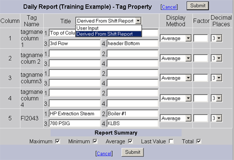 The Titles of the Columns for the Reports are specified in the Tag Property for each report (a column represents one Tag’s data). The three reports can have different Titles for each column or share the Titles based on another report (e.g. import Shift Report Titles to Daily, or Daily into Monthly).