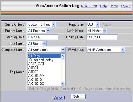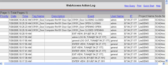 This shows a centralized Action Log for all SCADA Nodes in the project with Action Log to ODBC enabled. This is very similar to the Action Log in VIEW and ViewDAQ, but applied to all SCADA Nodes and Projects. The Action Log monitors Power User, General User, and Restricted User actions on the SCADA node. Action Log To ODBC must be enabled in the SCADA node properties.