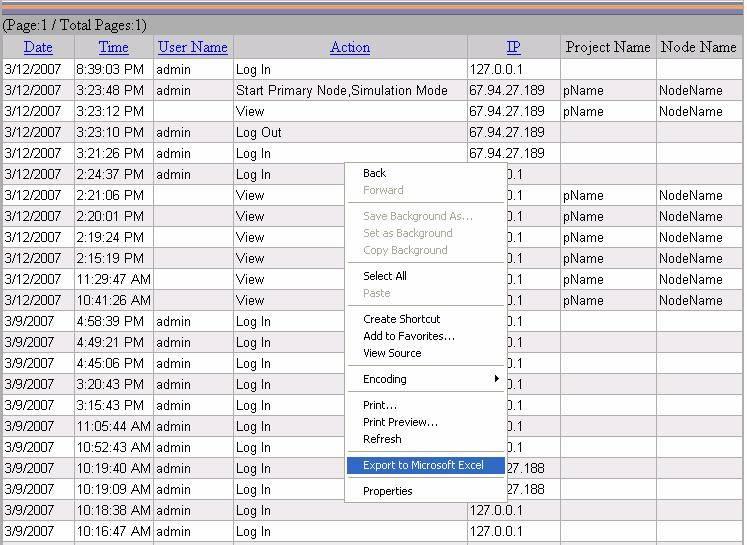 For Log Displays in WebAccess Configuration, use the right-click menu. “Export to Microsoft Excel” appears as a menu item by right-clicking the mouse ( a popup menu appears to export data). A version of Microsoft Excel which supports “Export to Microsoft Excel” (e.g. EXCEL 2002 or later) must be installed on the computers where IE is run (i.e. on the client).