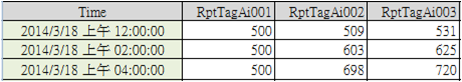 Description:One time period displays all selected Tag Names in one row. The value of the tag is displayed vertically under the tag name.