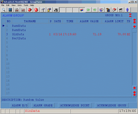 Pressing the Acknowledge Group pushbutton will acknowledge all active Alarms in the Alarm Group of the Selected Tag. There can be up to 100 Tags in an Alarm Group.